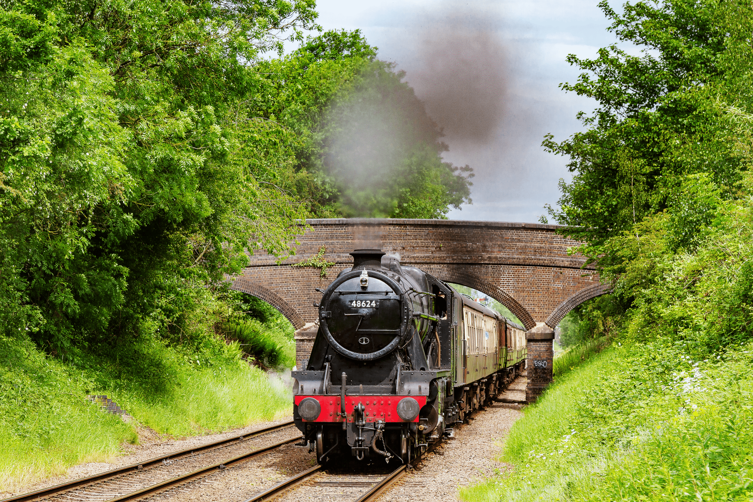 8624 is unique among preserved 8Fs as the only Southern Railway-built example. It spent its working life paired with a Fowler tender. Built in 1943 as part of a Railway Executive Committee order at Ashford Works, it was allocated to Willesden Shed throughout its career. Its service was relatively gentle, shown by the absence of the usual main frame repairs around the main driving wheel seen on almost all other preserved 8Fs, though its steel tyres are now close to needing replacement. The locomotive was withdrawn in 1965 due to a suspected fractured internal main steam pipe and spent years slowly rusting in Barry scrapyard in South Wales before being rescued in 1981.