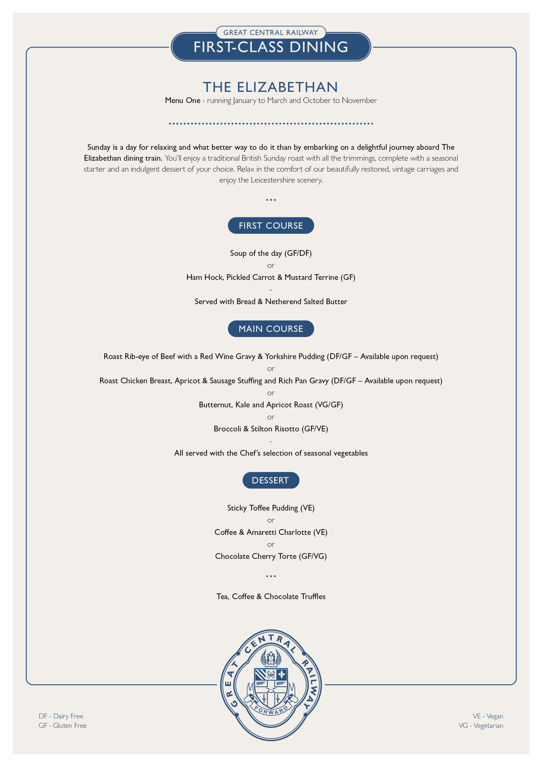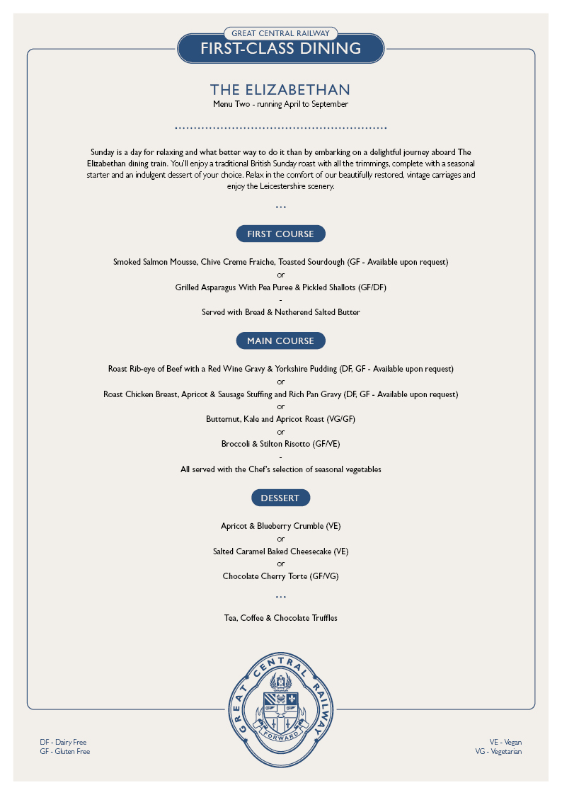 You’ll enjoy a traditional British Sunday roast with all the trimmings, complete with a seasonal soup to start and an indulgent dessert of your choice. Relax in the comfort of our beautifully restored, vintage carriages and enjoy the Leicestershire scenery.