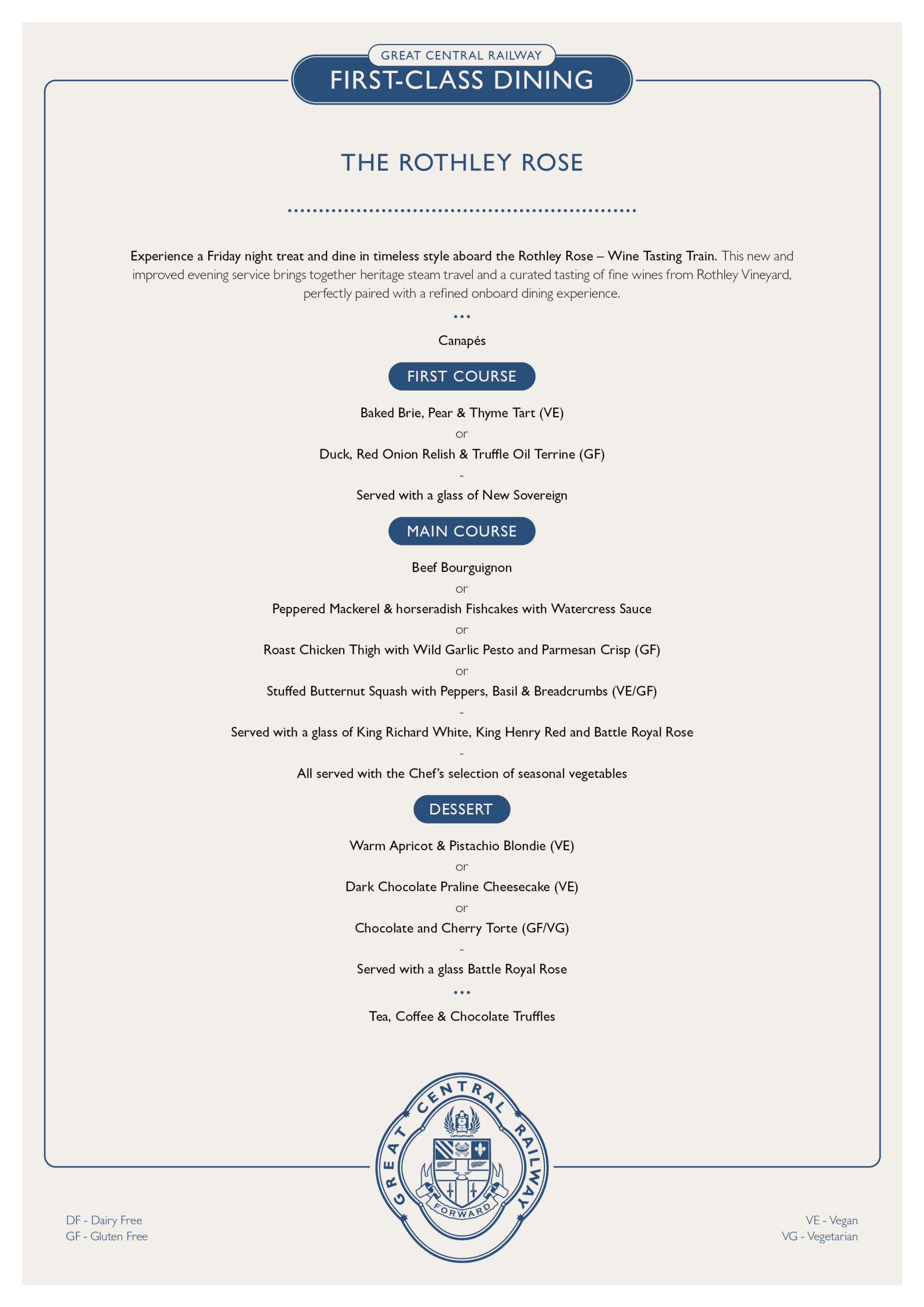 When you join us for a dining experience, please ask any member of the On-Train Dining Team before your meal is served if you are concerned about the presence of allergens in your food, or would like further information on our vegan and vegetarian dish preparation.