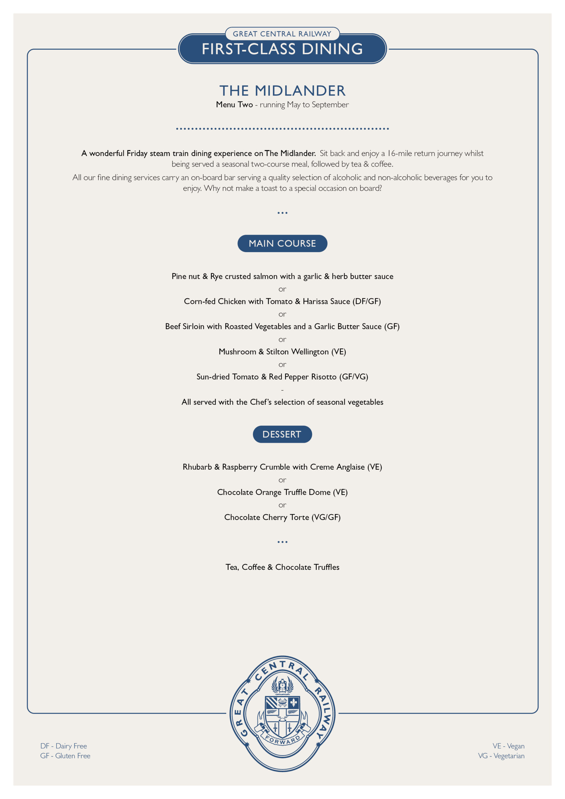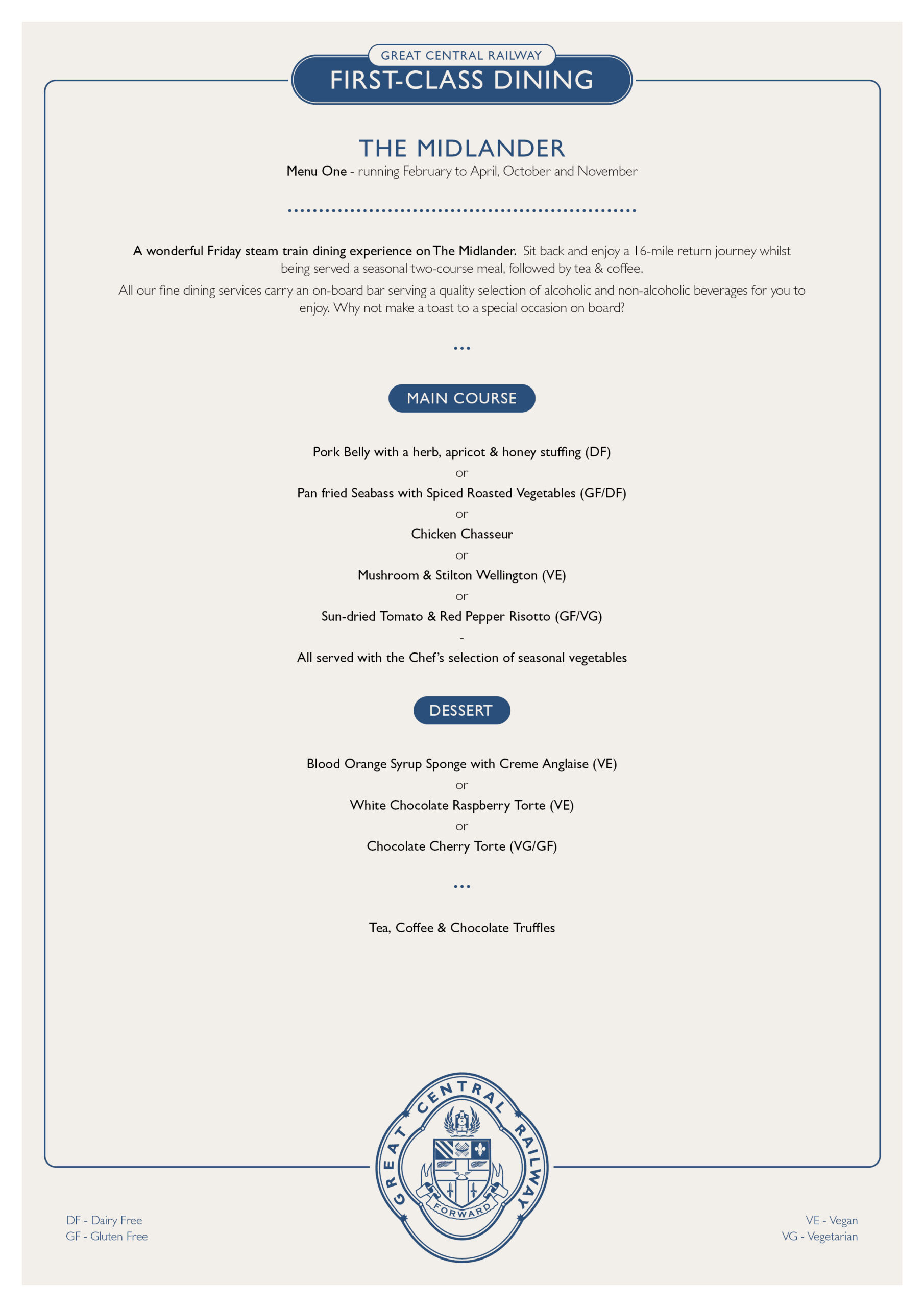 When you join us for a dining experience, please ask any member of the On-Train Dining Team before your meal is served if you are concerned about the presence of allergens in your food, or would like further information on our vegan and vegetarian dish preparation.