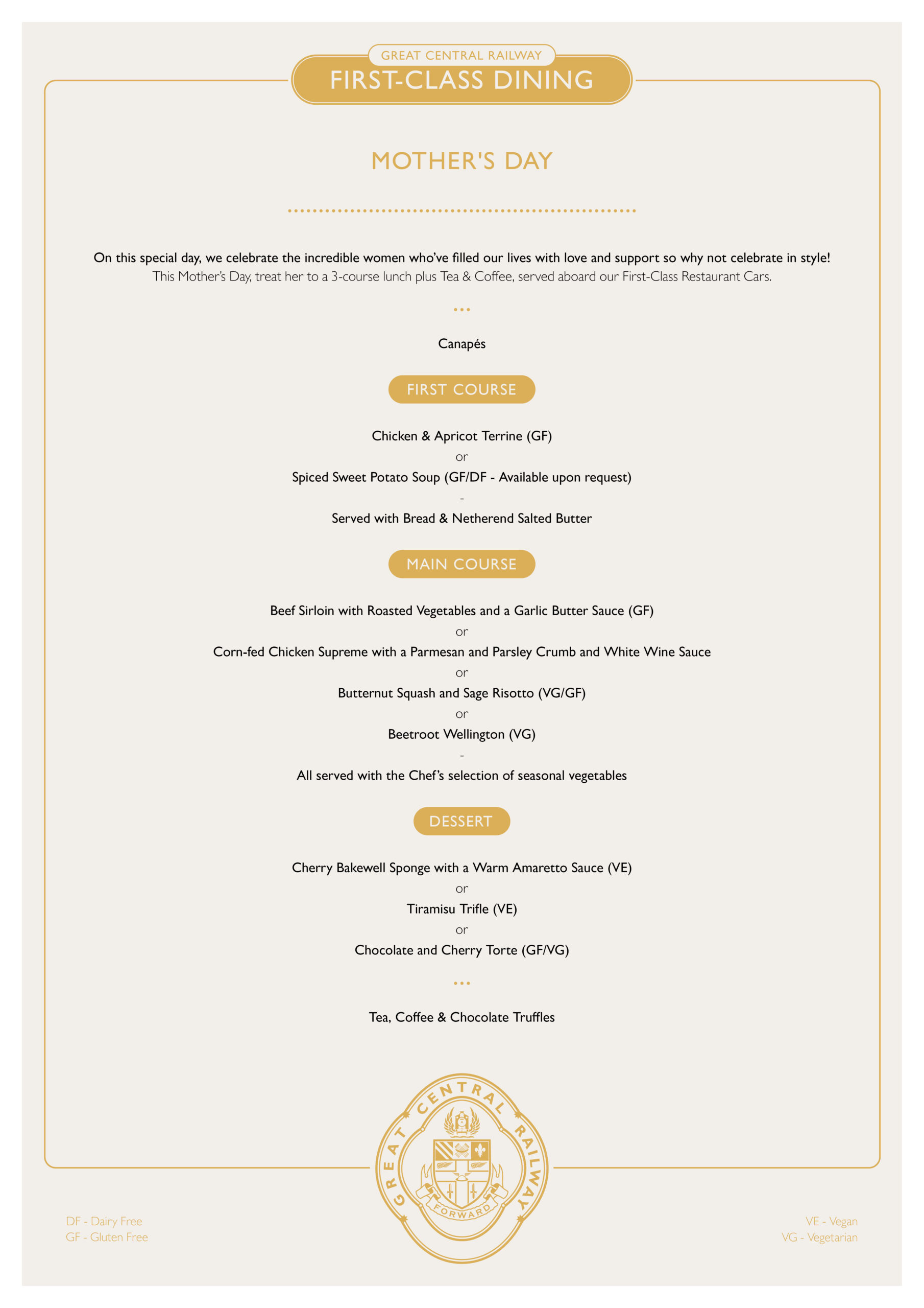 This Mother’s Day, treat her to a 3-course lunch plus Tea & Coffee, served aboard our First Class Restaurant Cars as a steam locomotive takes you on a leisurely journey through the Charnwood’s glorious countryside.